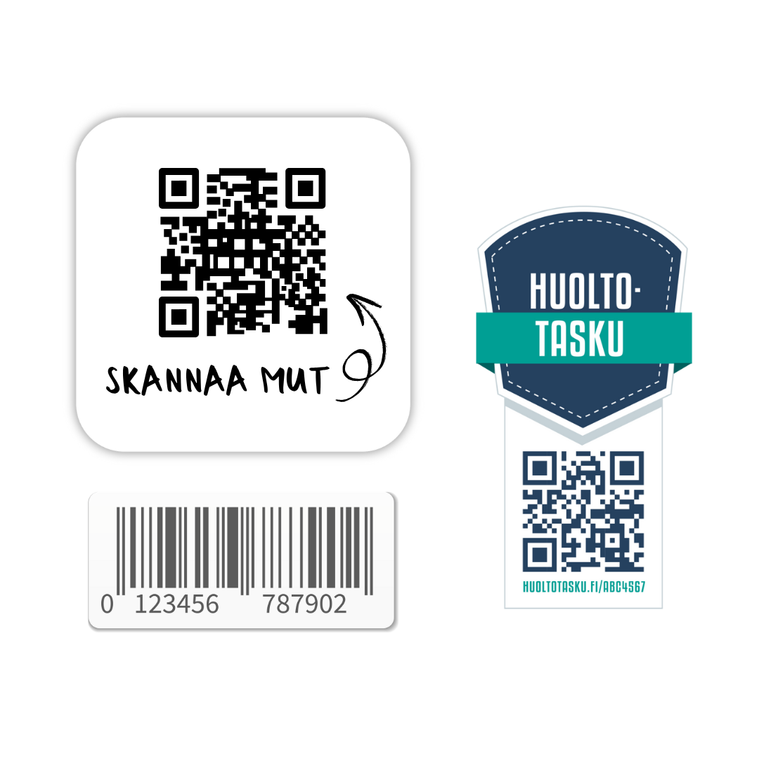 Tarrat postitetaan sinulle. Tarrojen saavuttua voit aloittaa niiden käytön! Kiinnitä QR-kooditarra huollettavaan laitteeseen (esim. takka, polkupyörä, pesukone...)
